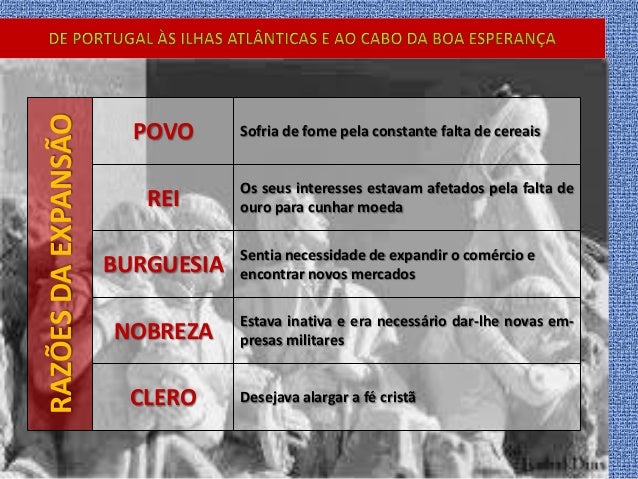 2. 2. RAZÕESDAEXPANSÃO POVO Sofria de fome pela constante falta de cereais REI Os seus interesses estavam afetados pela falta de ouro para cunhar moeda BURGUESIA Sentia necessidade de expandir o comércio e encontrar novos mercados NOBREZA Estava inativa e era necessário dar-lhe novas em- presas militares CLERO Desejava alargar a fé cristã