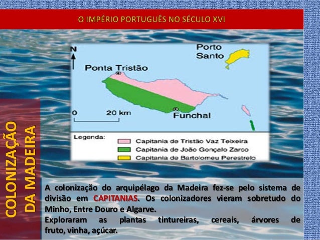 21. 21. COLONIZAÇÃO DAMADEIRA A colonização do arquipélago da Madeira fez-se pelo sistema de divisão em CAPITANIAS. Os colonizadores vieram sobretudo do Minho, Entre Douro e Algarve. Exploraram as plantas tintureiras, cereais, árvores de fruto, vinha, açúcar.