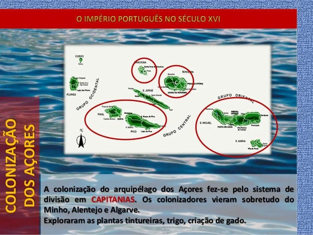 22. 22. COLONIZAÇÃO DOSAÇORES A colonização do arquipélago dos Açores fez-se pelo sistema de divisão em CAPITANIAS. Os colonizadores vieram sobretudo do Minho, Alentejo e Algarve. Exploraram as plantas tintureiras, trigo, criação de gado. c c c c