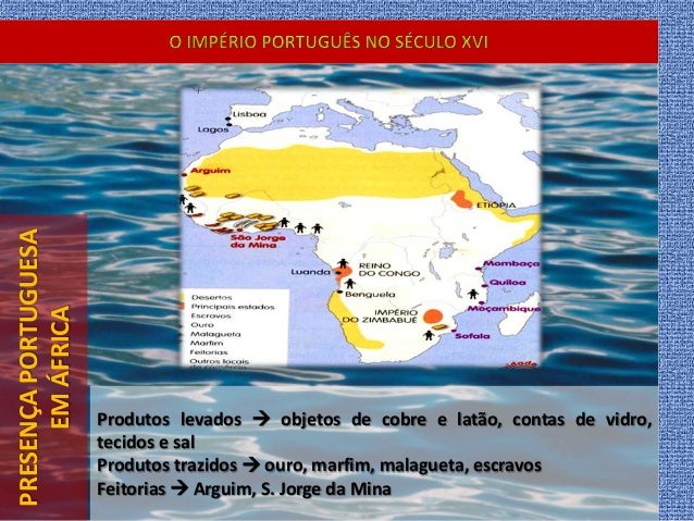 23. 23. PRESENÇAPORTUGUESA EMÁFRICA Produtos levados  objetos de cobre e latão, contas de vidro, tecidos e sal Produtos trazidos  ouro, marfim, malagueta, escravos Feitorias  Arguim, S. Jorge da Mina