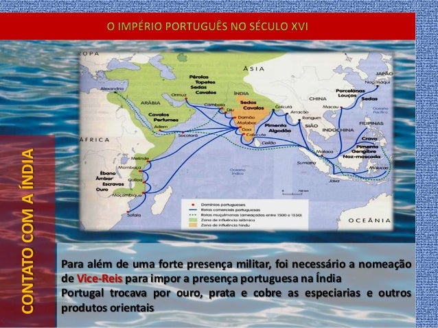 24. 24. CONTATOCOMAÍNDIA Para além de uma forte presença militar, foi necessário a nomeação de Vice-Reis para impor a presença portuguesa na Índia Portugal trocava por ouro, prata e cobre as especiarias e outros produtos orientais