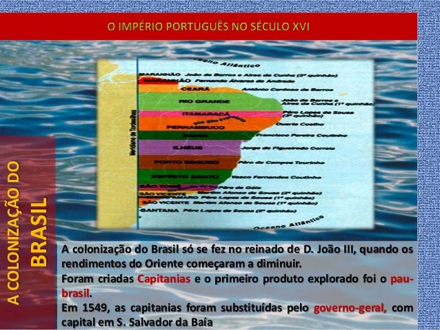 26. 26. ACOLONIZAÇÃODO BRASIL A colonização do Brasil só se fez no reinado de D. João III, quando os rendimentos do Oriente começaram a diminuir. Foram criadas Capitanias e o primeiro produto explorado foi o pau- brasil. Em 1549, as capitanias foram substituídas pelo governo-geral, com capital em S. Salvador da Baía