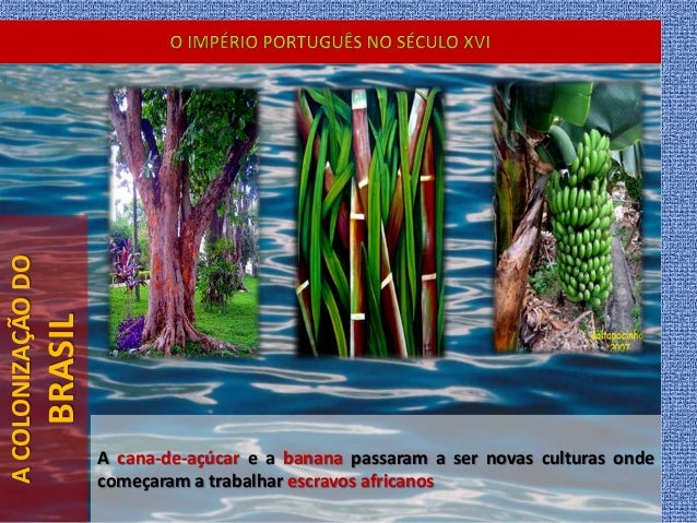 27. 27. ACOLONIZAÇÃODO BRASIL A cana-de-açúcar e a banana passaram a ser novas culturas onde começaram a trabalhar escravos africanos
