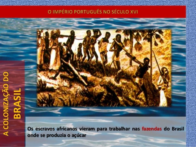 28. 28. ACOLONIZAÇÃODO BRASIL Os escravos africanos vieram para trabalhar nas fazendas do Brasil onde se produzia o açúcar