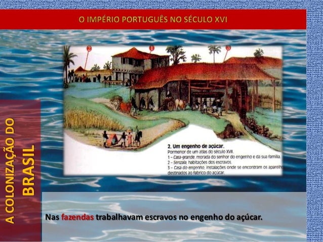 29. 29. ACOLONIZAÇÃODO BRASIL Nas fazendas trabalhavam escravos no engenho do açúcar.