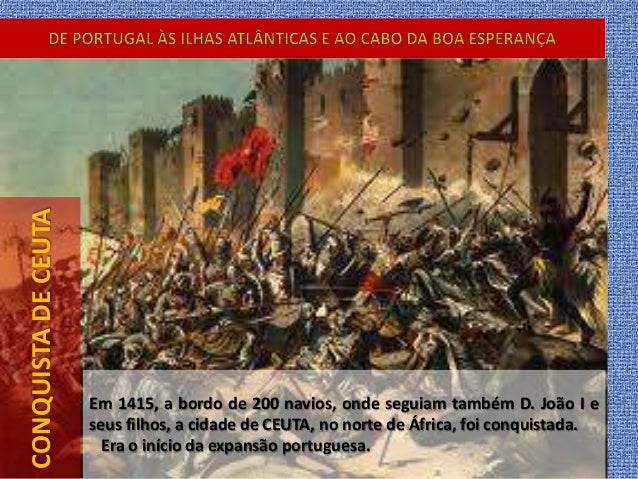 3. 3. CONQUISTADECEUTA Em 1415, a bordo de 200 navios, onde seguiam também D. João I e seus filhos, a cidade de CEUTA, no norte de África, foi conquistada. Era o início da expansão portuguesa.
