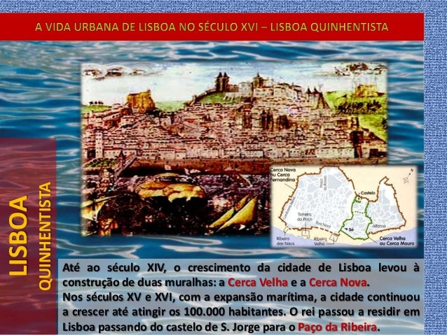 30. 30. LISBOA QUINHENTISTA Até ao século XIV, o crescimento da cidade de Lisboa levou à construção de duas muralhas: a Cerca Velha e a Cerca Nova. Nos séculos XV e XVI, com a expansão marítima, a cidade continuou a crescer até atingir os 100.000 habitantes. O rei passou a residir em Lisboa passando do castelo de S. Jorge para o Paço da Ribeira.