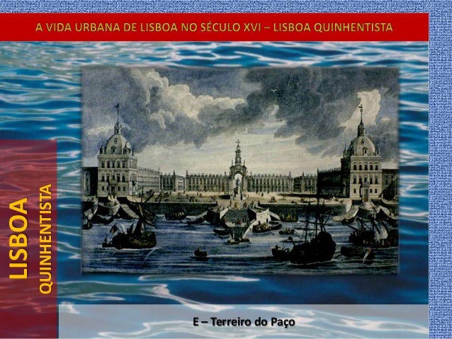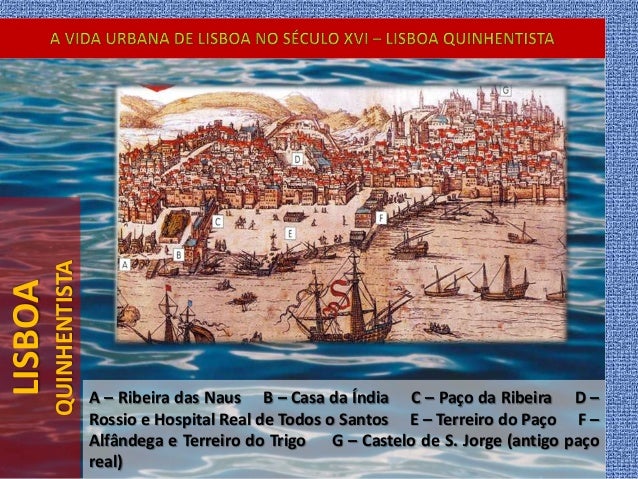 31. 31. LISBOA QUINHENTISTA A – Ribeira das Naus B – Casa da Índia C – Paço da Ribeira D – Rossio e Hospital Real de Todos o Santos E – Terreiro do Paço F – Alfândega e Terreiro do Trigo G – Castelo de S. Jorge (antigo paço real)