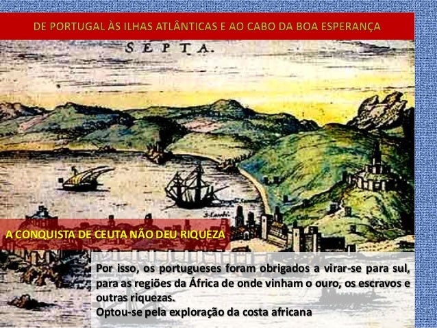 4. 4. A CONQUISTA DE CEUTA NÃO DEU RIQUEZA Por isso, os portugueses foram obrigados a virar-se para sul, para as regiões da África de onde vinham o ouro, os escravos e outras riquezas. Optou-se pela exploração da costa africana