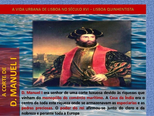 41. 41. ACORTEDE D.MANUELI D. Manuel I era senhor de uma corte luxuosa devido às riquezas que vinham do monopólio do comércio marítimo. A Casa da Índia era o centro de toda esta riqueza onde se armazenavam as especiarias e as pedras preciosas. O poder do rei afirmou-se junto do clero e da nobreza e perante toda a Europa