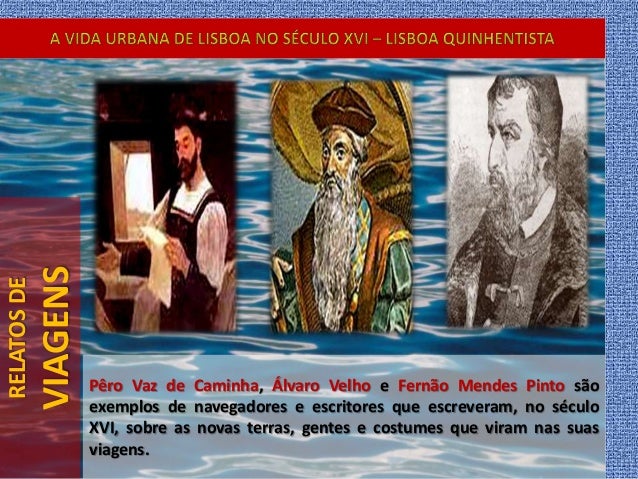 42. 42. RELATOSDE VIAGENS Pêro Vaz de Caminha, Álvaro Velho e Fernão Mendes Pinto são exemplos de navegadores e escritores que escreveram, no século XVI, sobre as novas terras, gentes e costumes que viram nas suas viagens.