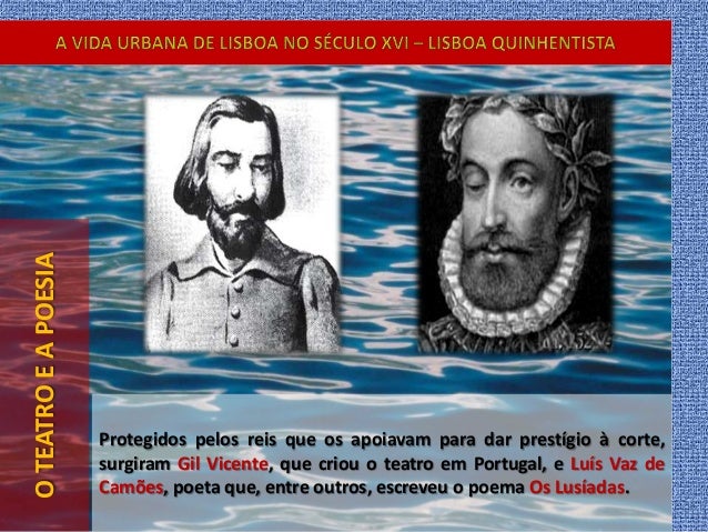 44. 44. OTEATROEAPOESIA Protegidos pelos reis que os apoiavam para dar prestígio à corte, surgiram Gil Vicente, que criou o teatro em Portugal, e Luís Vaz de Camões, poeta que, entre outros, escreveu o poema Os Lusíadas.