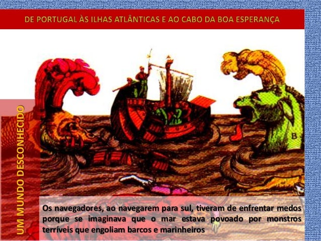 6. 6. UMMUNDODESCONHECIDO Os navegadores, ao navegarem para sul, tiveram de enfrentar medos porque se imaginava que o mar estava povoado por monstros terríveis que engoliam barcos e marinheiros