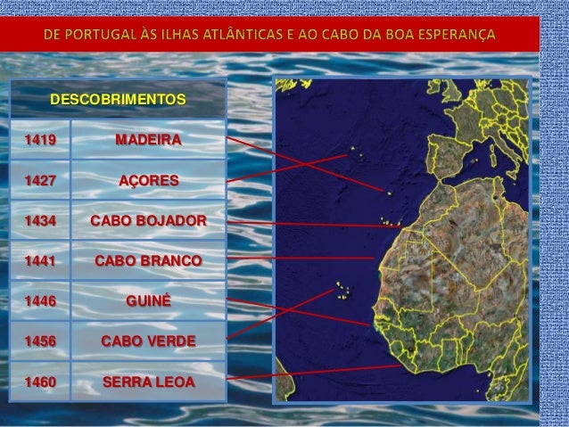 7. 7. DESCOBRIMENTOS 1419 MADEIRA 1427 AÇORES 1434 CABO BOJADOR 1441 CABO BRANCO 1446 GUINÉ 1456 CABO VERDE 1460 SERRA LEOA