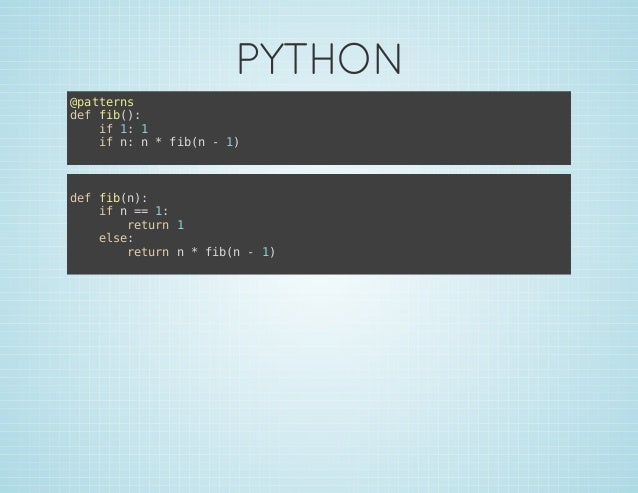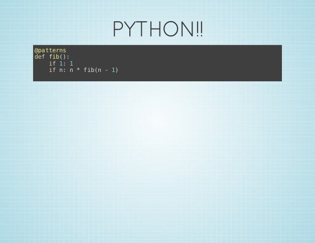 8. 8. PYTHON!! @patterns def fib(): if 1: 1 if n: n * fib(n - 1)