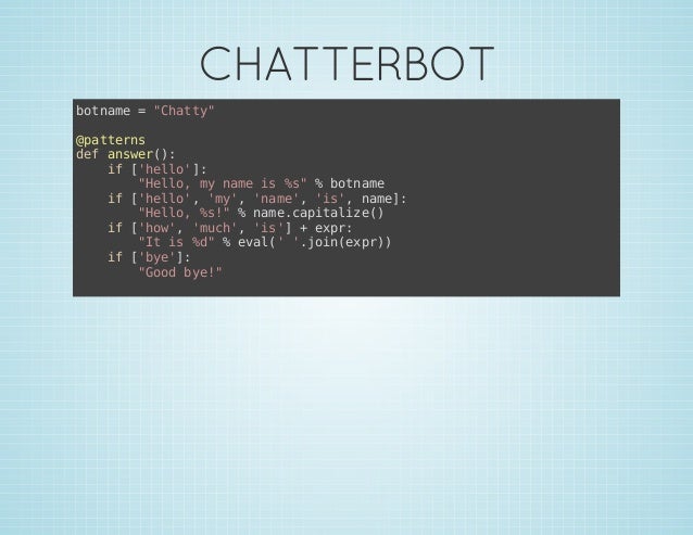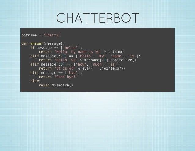 15. 15. CHATTERBOT botname = "Chatty" def answer(message): if message == ['hello']: return "Hello, my name is %s" % botname elif message[:-1] == ['hello', 'my', 'name', 'is']: return "Hello, %s" % message[-1].capitalize() elif message[:3] == ['how', 'much', 'is']: return "It is %d" % eval(' '.join(expr)) elif message == ['bye']: return "Good bye!" else: raise Mismatch()