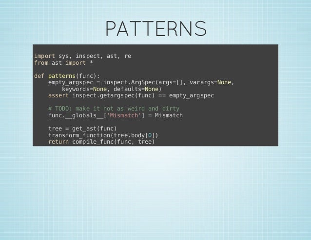 17. 17. PATTERNS import sys, inspect, ast, re from ast import * def patterns(func): empty_argspec = inspect.ArgSpec(args=[], varargs=None, keywords=None, defaults=None) assert inspect.getargspec(func) == empty_argspec # TODO: make it not as weird and dirty func.__globals__['Mismatch'] = Mismatch tree = get_ast(func) transform_function(tree.body[0]) return compile_func(func, tree)