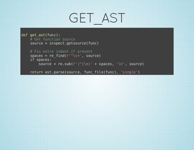 18. 18. GET_AST def get_ast(func): # Get function source source = inspect.getsource(func) # Fix extra indent if present spaces = re_find(r'^s+', source) if spaces: source = re.sub(r'(^|n)' + spaces, 'n', source) return ast.parse(source, func_file(func), 'single')
