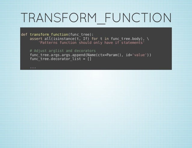 19. 19. TRANSFORM_FUNCTION def transform_function(func_tree): assert all(isinstance(t, If) for t in func_tree.body), 'Patterns function should only have if statements' # Adjust arglist and decorators func_tree.args.args.append(Name(ctx=Param(), id='value')) func_tree.decorator_list = [] ...