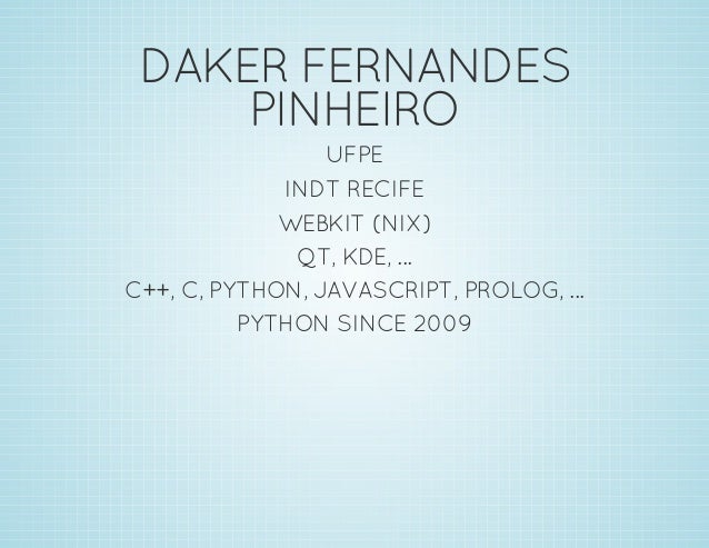 2. 2. DAKER FERNANDES PINHEIRO UFPE INDT RECIFE WEBKIT (NIX) QT, KDE, ... C++, C, PYTHON, JAVASCRIPT, PROLOG, ... PYTHON SINCE 2009