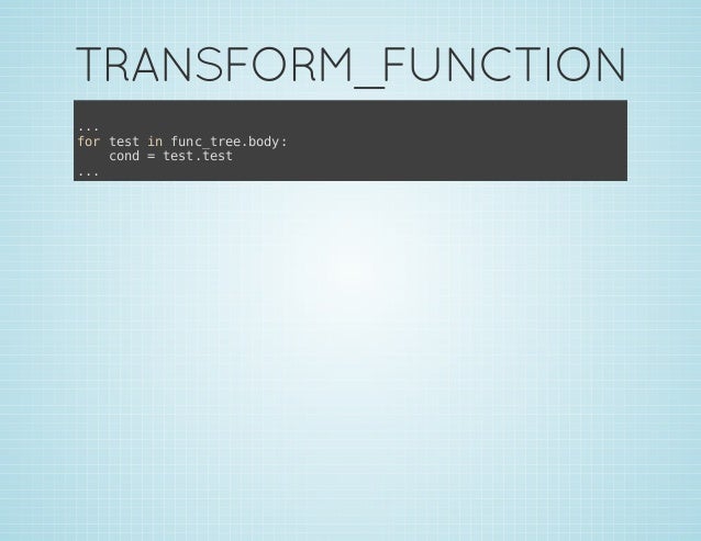 20. 20. TRANSFORM_FUNCTION ... for test in func_tree.body: cond = test.test ...
