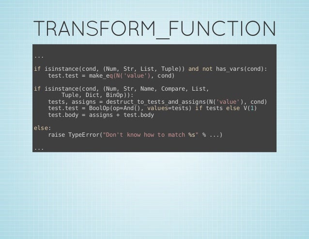 22. 22. TRANSFORM_FUNCTION ... if isinstance(cond, (Num, Str, List, Tuple)) and not has_vars(cond): test.test = make_eq(N('value'), cond) if isinstance(cond, (Num, Str, Name, Compare, List, Tuple, Dict, BinOp)): tests, assigns = destruct_to_tests_and_assigns(N('value'), cond) test.test = BoolOp(op=And(), values=tests) if tests else V(1) test.body = assigns + test.body else: raise TypeError("Don't know how to match %s" % ...) ...