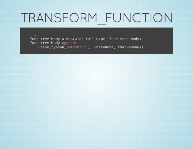 23. 23. TRANSFORM_FUNCTION ... func_tree.body = map(wrap_tail_expr, func_tree.body) func_tree.body.append( Raise(type=N('Mismatch'), inst=None, tback=None))