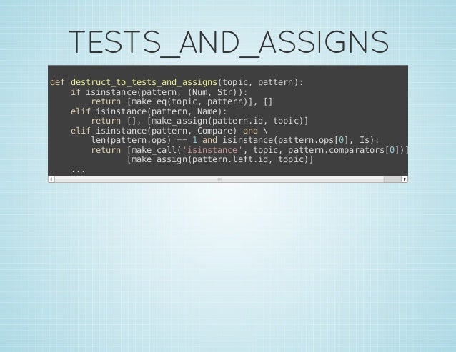 24. 24. TESTS_AND_ASSIGNS def destruct_to_tests_and_assigns(topic, pattern): if isinstance(pattern, (Num, Str)): return [make_eq(topic, pattern)], [] elif isinstance(pattern, Name): return [], [make_assign(pattern.id, topic)] elif isinstance(pattern, Compare) and len(pattern.ops) == 1 and isinstance(pattern.ops[0], Is): return [make_call('isinstance', topic, pattern.comparators[0])], [make_assign(pattern.left.id, topic)] ...