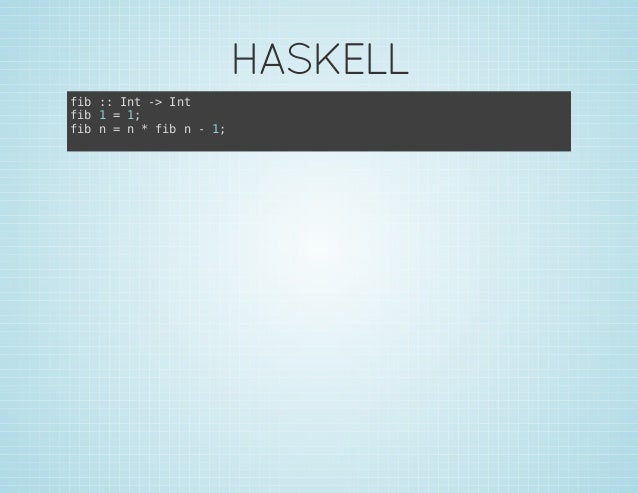 5. 5. HASKELL fib :: Int -> Int fib 1 = 1; fib n = n * fib n - 1;