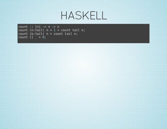 6. 6. HASKELL count :: [n] -> n -> n count (n:tail) n = 1 + count tail n; count (k:tail) n = count tail n; count [] _ = 0;