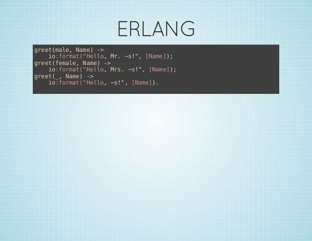 7. 7. ERLANG greet(male, Name) -> io:format("Hello, Mr. ~s!", [Name]); greet(female, Name) -> io:format("Hello, Mrs. ~s!", [Name]); greet(_, Name) -> io:format("Hello, ~s!", [Name]).