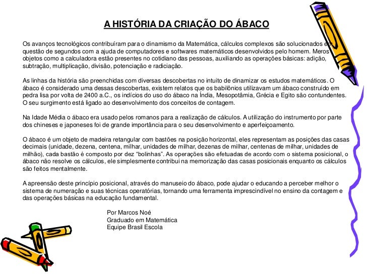 1. 1. A HISTÓRIA DA CRIAÇÃO DO ÁBACOOs avanços tecnológicos contribuíram para o dinamismo da Matemática, cálculos complexos são solucionados emquestão de segundos com a ajuda de computadores e softwares matemáticos desenvolvidos pelo homem. Merosobjetos como a calculadora estão presentes no cotidiano das pessoas, auxiliando as operações básicas: adição,subtração, multiplicação, divisão, potenciação e radiciação.As linhas da história são preenchidas com diversas descobertas no intuito de dinamizar os estudos matemáticos. Oábaco é considerado uma dessas descobertas, existem relatos que os babilônios utilizavam um ábaco construído empedra lisa por volta de 2400 a.C., os indícios do uso do ábaco na Índia, Mesopotâmia, Grécia e Egito são contundentes.O seu surgimento está ligado ao desenvolvimento dos conceitos de contagem.Na Idade Média o ábaco era usado pelos romanos para a realização de cálculos. A utilização do instrumento por partedos chineses e japoneses foi de grande importância para o seu desenvolvimento e aperfeiçoamento.O ábaco é um objeto de madeira retangular com bastões na posição horizontal, eles representam as posições das casasdecimais (unidade, dezena, centena, milhar, unidades de milhar, dezenas de milhar, centenas de milhar, unidades demilhão), cada bastão é composto por dez “bolinhas”. As operações são efetuadas de acordo com o sistema posicional, oábaco não resolve os cálculos, ele simplesmente contribui na memorização das casas posicionais enquanto os cálculossão feitos mentalmente.A apreensão deste princípio posicional, através do manuseio do ábaco, pode ajudar o educando a perceber melhor osistema de numeração e suas técnicas operatórias, tornando uma ferramenta imprescindível no ensino da contagem edas operações básicas na educação fundamental. Por Marcos Noé Graduado em Matemática Equipe Brasil Escola
