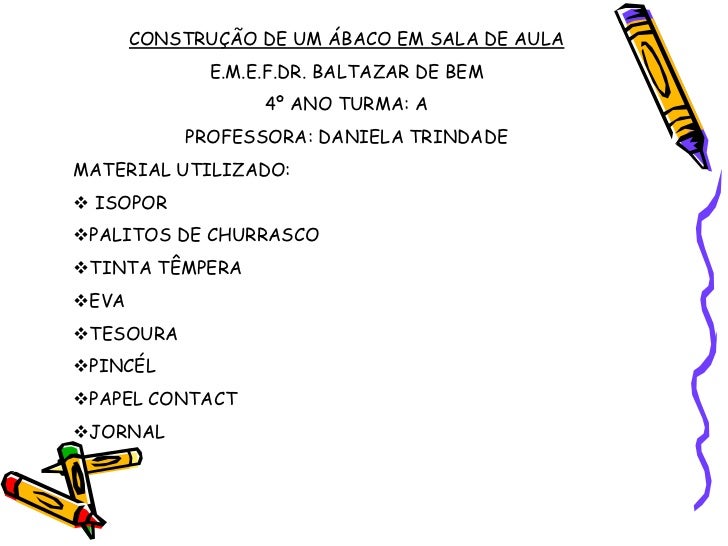 2. 2. CONSTRUÇÃO DE UM ÁBACO EM SALA DE AULA E.M.E.F.DR. BALTAZAR DE BEM 4º ANO TURMA: A PROFESSORA: DANIELA TRINDADEMATERIAL UTILIZADO: ISOPORPALITOS DE CHURRASCOTINTA TÊMPERAEVATESOURAPINCÉLPAPEL CONTACTJORNAL