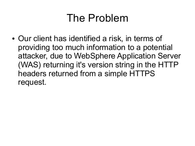 2. 2. The Problem ● Our client has identified a risk, in terms of providing too much information to a potential attacker, due to WebSphere Application Server (WAS) returning it's version string in the HTTP headers returned from a simple HTTPS request.