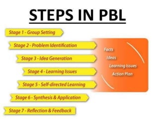 This document discusses problem-based learning (PBL). It defines PBL as a student-centered learning approach where students learn through solving open-ended problems. Key features of PBL include using real-world problems to initiate learning, not providing all information up front, and requiring students to work in groups to identify resources and solve problems. The document also outlines uses, advantages, and disadvantages of PBL, noting it improves problem-solving skills but requires significant time and guidance from teachers.