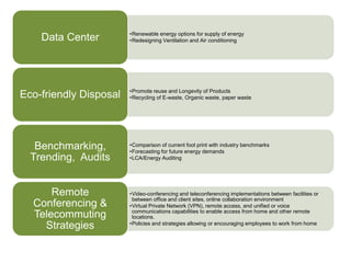 This document discusses green information and communication technology (ICT) and data centers in India. It provides facts about the size and growth of data centers in India, including that the total data center capacity is expected to reach 5.1 million square feet by 2012. It also gives details about specific large data centers run by major IT companies in India, such as Tata Communications' Pune data center which has 54,520 square feet of space. The document concludes by noting the importance of cost cutting but also being good neighbors through green investments.