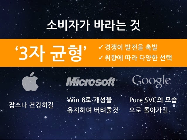 58. 58. 소비자가$바라는$것 ‘3자.균형’ ✓$경쟁이$발전을$촉발 ✓$취향에$따라$다양한$선택$ Win$8로$개성을$ Pure$SVC의$모습잡스나$건강하길 유지하며$버텨줄것 으로$돌아가길