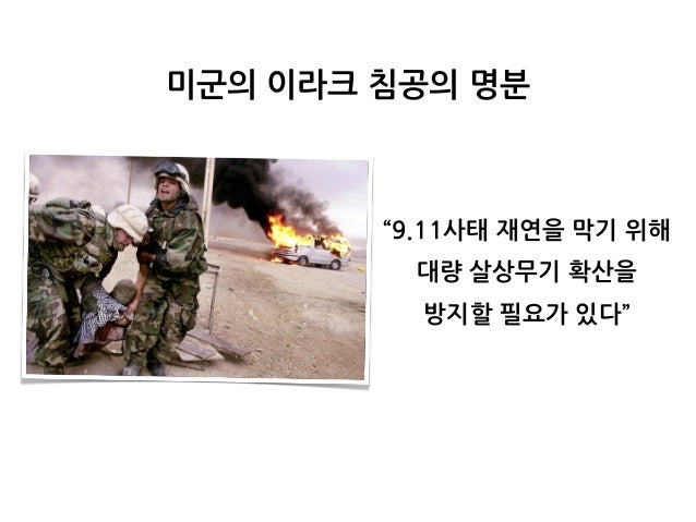 27. 27. 미군의$이라크$침공의$명분 “9.11사태$재연을$막기$위해$ 대량$살상무기$확산을$ 방지할$필요가$있다”$