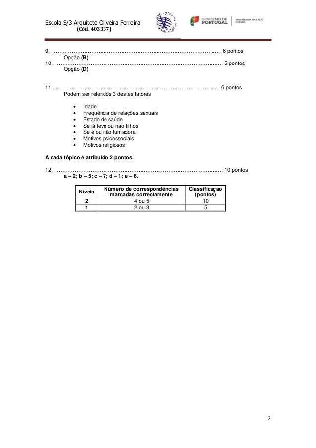 2. 2. Escola S/3 Arquiteto Oliveira Ferreira (Cód. 403337)9. …………………………………………………………………………………. 6 pontos Opção (B)10. …………………………………………………………………………………. 5 pontos Opção (D)11. …………………………………………………………………………………. 6 pontos Podem ser referidos 3 destes fatores  Idade  Frequência de relações sexuais  Estado de saúde  Se já teve ou não filhos  Se é ou não fumadora  Motivos psicossociais  Motivos religiososA cada tópico é atribuído 2 pontos.12. …………………………………………………………………………………. 10 pontos a – 2; b – 5; c – 7; d – 1; e – 6. Número de correspondências Classificação Níveis marcadas correctamente (pontos) 2 4 ou 5 10 1 2 ou 3 5 2