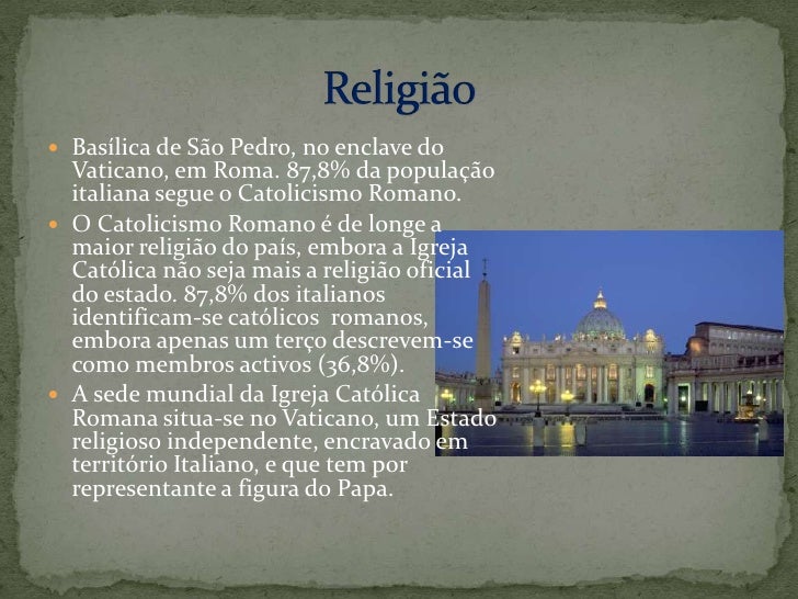 11. 11. Basílica de São Pedro, no enclave do Vaticano, em Roma. 87,8% da população italiana segue o Catolicismo Romano.<br />O Catolicismo Romano é de longe a maior religião do país, embora a Igreja Católica não seja mais a religião oficial do estado. 87,8% dos italianos identificam-se católicos romanos,embora apenas um terço descrevem-se como membros activos (36,8%). <br />A sede mundial da Igreja Católica Romana situa-se no Vaticano, um Estado religioso independente, encravado em território Italiano, e que tem por representante a figura do Papa.<br />Religião<br />