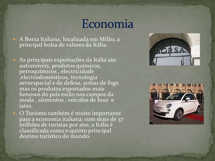 12. 12. A Borsa Italiana, localizada em Milão, a principal bolsa de valores da Itália.<br />As principais exportações da Itália são automóveis, produtos químicos, petroquímicos , electricidade ,electrodomésticos, tecnologia aeroespacial e de defesa, armas de fogo mas os produtos exportados mais famosos do país estão nos campos da moda , alimentos , veículos de luxo e iates.<br />O Turismo também é muito importante para a economia italiana: com mais de 37 milhões de turistas por ano, a Itália é classificada como o quinto principal destino turístico do mundo.<br />Economia<br />