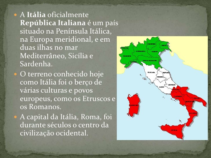 2. 2. A Itália oficialmente República Italiana é um país situado na Península Itálica, na Europa meridional, e em duas ilhas no mar Mediterrâneo, Sicília e Sardenha.<br />O terreno conhecido hoje como Itália foi o berço de várias culturas e povos europeus, como os Etruscos e os Romanos. <br />A capital da Itália, Roma, foi durante séculos o centro da civilização ocidental. <br />