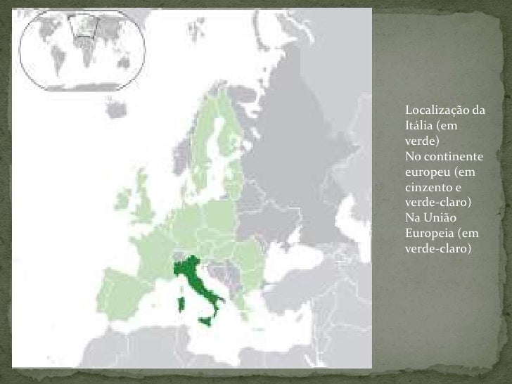 3. 3. Localização da Itália (em verde)No continente europeu (em cinzento e verde-claro)Na União Europeia (em verde-claro)<br />