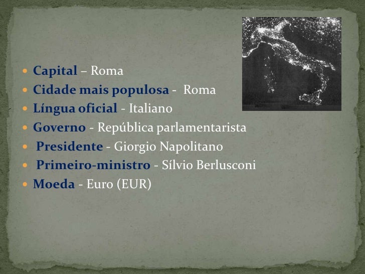 4. 4. Capital– Roma<br />Cidade mais populosa- Roma<br />Língua oficial- Italiano<br />Governo - República parlamentarista<br /> Presidente- Giorgio Napolitano<br /> Primeiro-ministro- Sílvio Berlusconi<br />Moeda - Euro (EUR)<br />