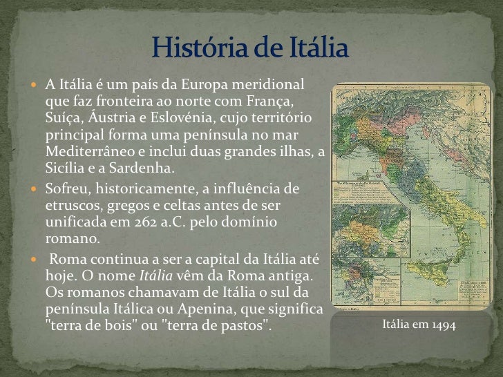 5. 5. História de Itália<br />A Itália é um país da Europa meridional que faz fronteira ao norte com França, Suíça, Áustria e Eslovénia, cujo território principal forma uma península no mar Mediterrâneo e inclui duas grandes ilhas, a Sicília e a Sardenha. <br />Sofreu, historicamente, a influência de etruscos, gregos e celtas antes de ser unificada em 262 a.C. pelo domínio romano.<br /> Roma continua a ser a capital da Itália até hoje. O nome Itália vêm da Roma antiga. Os romanos chamavam de Itália o sul da península Itálica ou Apenina, que significa "terra de bois" ou "terra de pastos".<br />Itália em 1494<br />