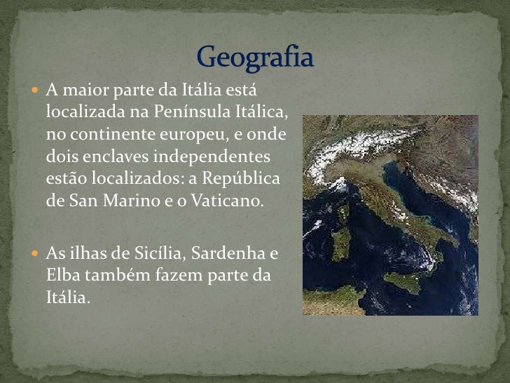 6. 6. A maior parte da Itália está localizada na Península Itálica, no continente europeu, e onde dois enclaves independentes estão localizados: a República de San Marino e o Vaticano. <br />As ilhas de Sicília, Sardenha e Elba também fazem parte da Itália. <br />Geografia<br />