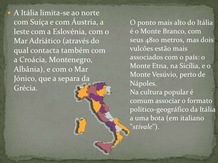 7. 7. A Itália limita-se ao norte com Suíça e com Áustria, a leste com a Eslovénia, com o Mar Adriático (através do qual contacta também com a Croácia, Montenegro, Albânia), e com o Mar Jónico, que a separa da Grécia.<br />O ponto mais alto do Itália é o Monte Branco, com seus 4810 metros, mas dois vulcões estão mais associados com o país: o Monte Etna, na Sicília, e o Monte Vesúvio, perto de Nápoles. <br />Na cultura popular é comum associar o formato político-geográfico da Itália a uma bota (em italiano "stivale").<br />