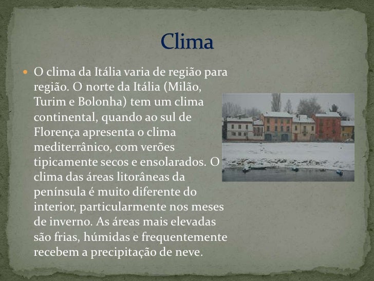 8. 8. O clima da Itália varia de região para região. O norte da Itália (Milão, Turim e Bolonha) tem um clima continental, quando ao sul de Florença apresenta o clima mediterrânico, com verões tipicamente secos e ensolarados. O clima das áreas litorâneas da península é muito diferente do interior, particularmente nos meses de inverno. As áreas mais elevadas são frias, húmidas e frequentemente recebem a precipitação de neve.<br />Clima<br />