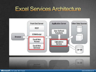 This document provides an overview of Excel Services 2010 including its key components, new features, and how it enables sharing and securing Excel workbooks through a browser. Excel Services allows users to share spreadsheets, build business intelligence dashboards, reuse logic from workbooks, and build reports without needing Excel installed. It consists of the Excel Calculation Service for loading, calculating, and refreshing workbooks, and the Excel Web Access web front end for interacting with workbooks in a browser without ActiveX controls. The Excel Web Service also provides APIs to build custom applications that integrate with Excel Services functionality.