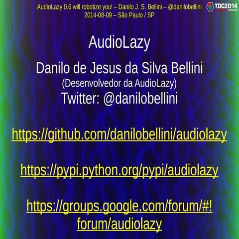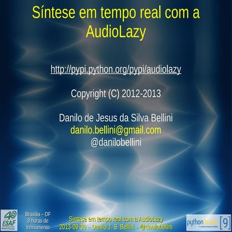 A AudioLazy é uma biblioteca (pacote) em Python para processamento digital de sinais (DSP) permitindo análise, síntese e processamento de sinais unidimensionais (áudio) em tempo real através de estruturas expressivas tais como transformadas Z (engenharia elétrica, teoria de controle), processamento tardio descrito como fluxo de informação, objetos (e.g. filtros, sinais, etc.), sobrecarga de operadores (somar sinais, multiplicar sinal por um ganho constante, etc.), etc.. A palestra introduzirá parte das funcionalidades do pacote através de exemplos práticos prontos (síntese FM, síntese subtrativa, áudio para games, afinador de instrumentos musicais, etc.), incluindo exemplos de tarefas secundárias possíveis com o pacote (e.g. cálculo numérico, geração de imagens).